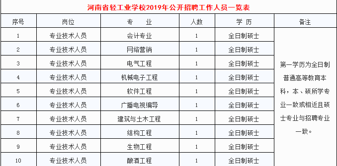根据我校专业技术人员岗位空缺情况和学校发展需要,招聘10名全日制硕士毕业生。详见附件《河南省轻工业学校2019年公开招聘工作人员一览表》。